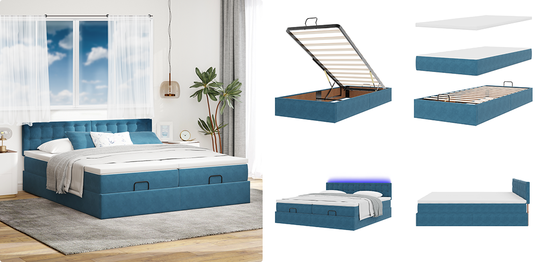 Ta funkcionalen posteljni okvir združuje udobje in praktičnost. Pod posteljo je veliko prostora za shranjevanje, zato lahko prihraniš prostor in ohraniš slog. Umetno usnje je preprosto za vzdrževanje ter dodaja eleganten, brezčasen pridih, hidravlični dvižni mehanizem pa olajša dostop do shranjenih stvari. Vgrajene LED svetilke dodajajo nežen sijaj za ustvarjanje sodobnega pridiha in sproščenega vzdušja v spalnici.