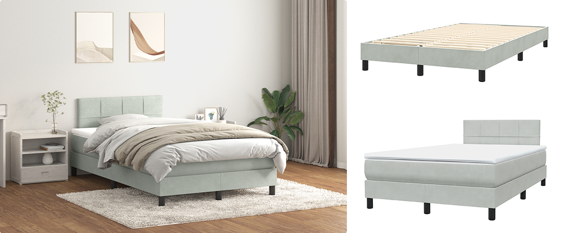 Ta posteljni komplet vključuje posteljni okvir, žepkasto vzmetnico in mehak nadvložek za popolno udobje. Žametni okvir doda prijeten pridih, medtem ko žepkaste vzmeti zagotavljajo prilagojeno podporo in zmanjšujejo prenos gibanja. Letveno dno nudi dodatno zračnost in ohranja vzmetnico svežo. To je popoln komplet za miren spanec.