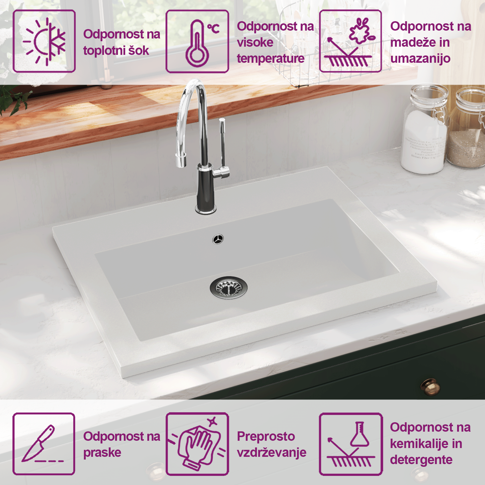 Glaziran granit in moderen dizajn se bosta podala k vsakemu dekorju. Posebna odprtina bo poskrbela za odtekanje vode, ko se bo umivalnik napolnil. Umivalnik ima odprtino za namestitev pipe. Premer odprtine za pipo je 35 mm. Umivalnik je preprost za čiščenje.