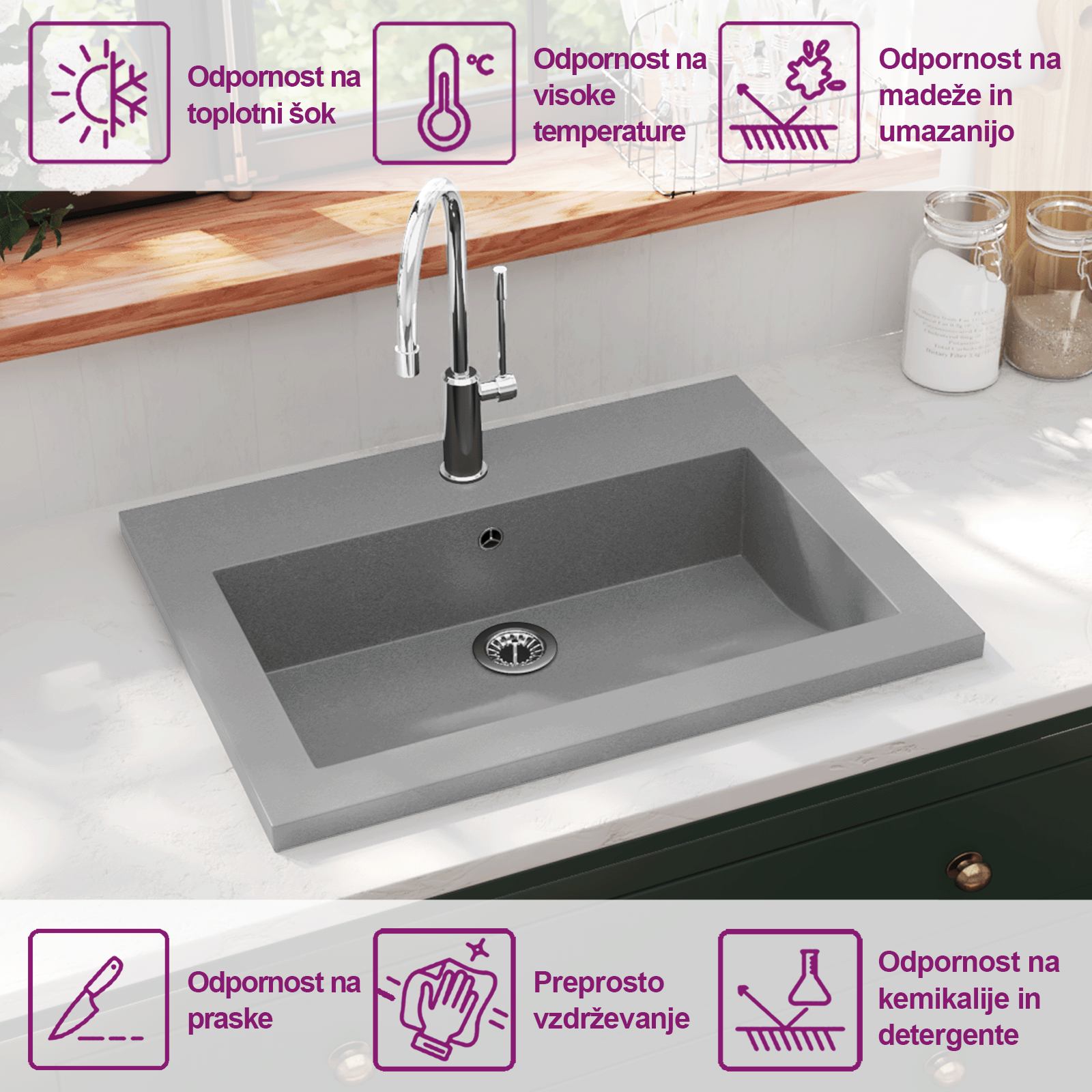 Glaziran granit in moderen dizajn se bosta podala k vsakemu dekorju. Posebna odprtina bo poskrbela za odtekanje vode, ko se bo umivalnik napolnil. Umivalnik ima odprtino za namestitev pipe. Premer odprtine za pipo je 35 mm. Umivalnik je preprost za čiščenje.